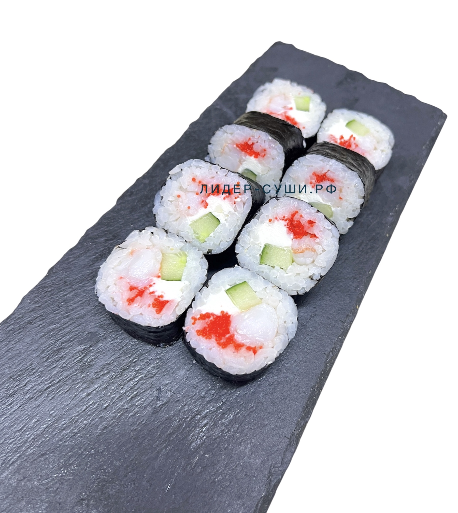 Тигровые креветки, сливочный сыр, огурец, икра тобико.