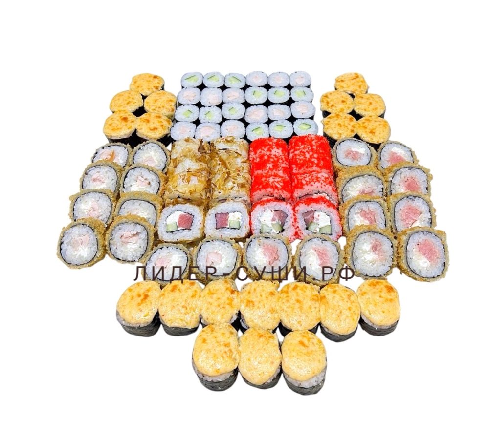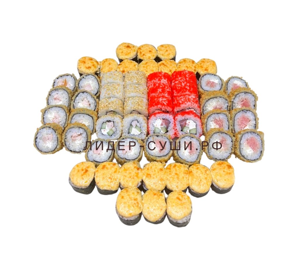 Запечённый с тигровой креветкой, запечённый с лососем, 2 запечённых с курочкой .